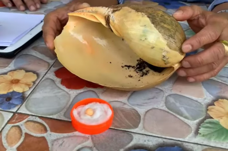 นายวิรัตน์ เล่าว่า ย้อนกลับไปเมื่อช่วงกลางปี 2562 ตนได้เดินทางไปซื้อหอยโข่งทะเล จำนวน 4-5 ตัว ที่ตลาดสดเทศบาลเมืองกันตัง ในราคา 100 กว่าบาท เพื่อจะนำมาทำกับแกล้มกินกับเพื่อนและครอบครัว โดยปกติตนชอบซื้อหอยโข่งมากินอยู่แล้วเป็นประจำ ก่อนจะนำมาต้มทั้งหมด เมื่อสุกก็นำมาหั่นพร้อมที่จะเอาไปรับประทาน แต่ปรากฎว่าในขณะทำอาหาร 1 ใน 5 ตัวนั้น พบว่ามีสิ่งแปลกปลอมอยู่ จึงเอาออกมาดูและเก็บไว้ โดยที่ไม่รู้ว่าเป็นอะไร แต่คิดเพียงว่าเป็นมุกที่แปลกดี และจะเก็บเอาไว้ทำหัวแหวน แต่หลังจากนั้นก็ไม่ได้นำออกมาดูอีกเลย