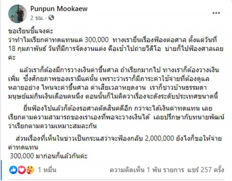 วันที่ 23 ก.พ. 64 เฟซบุ๊กภรรยาหลวง ได้มีการออกมาโพสต์ข้อความ ชี้แจงกรณีฟ้องศาลเรียกค่าทดแทน 3 แสนบาท โดยระบุว่า "ขอเรียนชี้แจงค่ะ ว่าทำไมเรียกค่าทดแทนแค่ 300,000 ทางเรายื่นเรื่องฟ้องต่อศาล ตั้งแต่วันที่ 18 กุมภาพันธ์ วันที่มีการจัดงานแต่ง คือเช้าไปถ่ายวีดิโอ บ่ายก็ไปฟ้องศาลเลยค่ะ แล้วเราก็ต้องมีการวางเงินค่าขึ้นศาล ถ้าเรียกมากไป ทางเราก็ต้องวางเงินเพิ่ม ซึ่งศักยภาพของเรามีแค่นั้น เพราะว่าเราก็มีภาระค่าใช้จ่ายที่ต้องดูแลหลายอย่าง ไหนจะค่าขึ้นศาล ค่าเสียเวลาหยุดงาน เราก็ชาวบ้านธรรมดามนุษย์แม่กินเงินเดือนคนนึง ตอนนั้นก็ไม่คิดว่าเรื่องจะดังระดับประเทศขนาดนี้