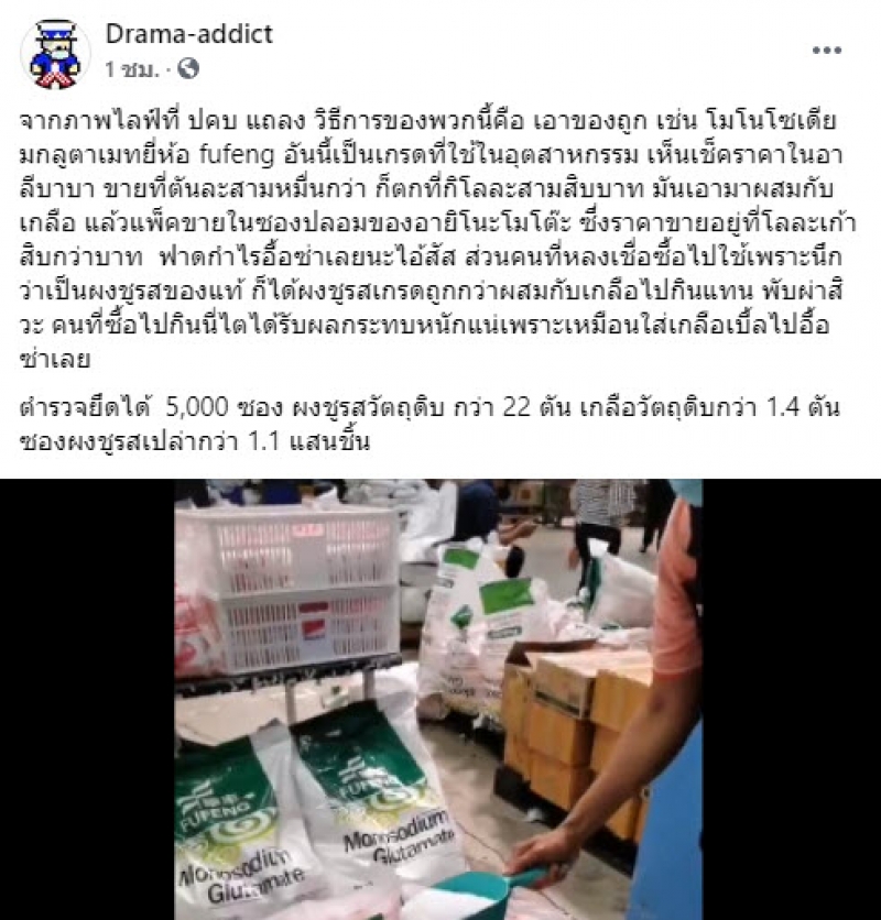 ต่อมาเพจDrama-addict ได้เผยประเด็นนี้ว่า ผงชูรสปลอมที่เขาทำออกมาขายนั้น ทำมาจากอะไรโดยระบุว่า จากภาพไลฟ์ที่ ปคบ แถลง วิธีการของพวกนี้คือ เอาของถูก เช่น โมโนโซเดียมกลูตาเมทยี่ห้อ fufeng อันนี้เป็นเกรดที่ใช้ในอุตสาหกรรม เห็นเช็คราคาในอาลีบาบา ขายที่ตันละสามหมื่นกว่า ก็ตกที่กิโลละสามสิบบาท มันเอามาผสมกับเกลือ แล้วแพ็คขายในซองปลอมของอายิโนะโมโต๊ะ ซึ่งราคาขายอยู่ที่โลละเก้าสิบกว่าบาท ฟาดกำไรอื้อซ่าเลยนะ ส่วนคนที่หลงเชื่อซื้อไปใช้เพราะนึกว่าเป็นผงชูรสของแท้ ก็ได้ผงชูรสเกรดถูกกว่าผสมกับเกลือไปกินแทน พับผ่าสิวะ คนที่ซื้อไปกินนี่ไตได้รับผลกระทบหนักแน่เพราะเหมือนใส่เกลือเบื้ลไปอื้อซ่าเลย
