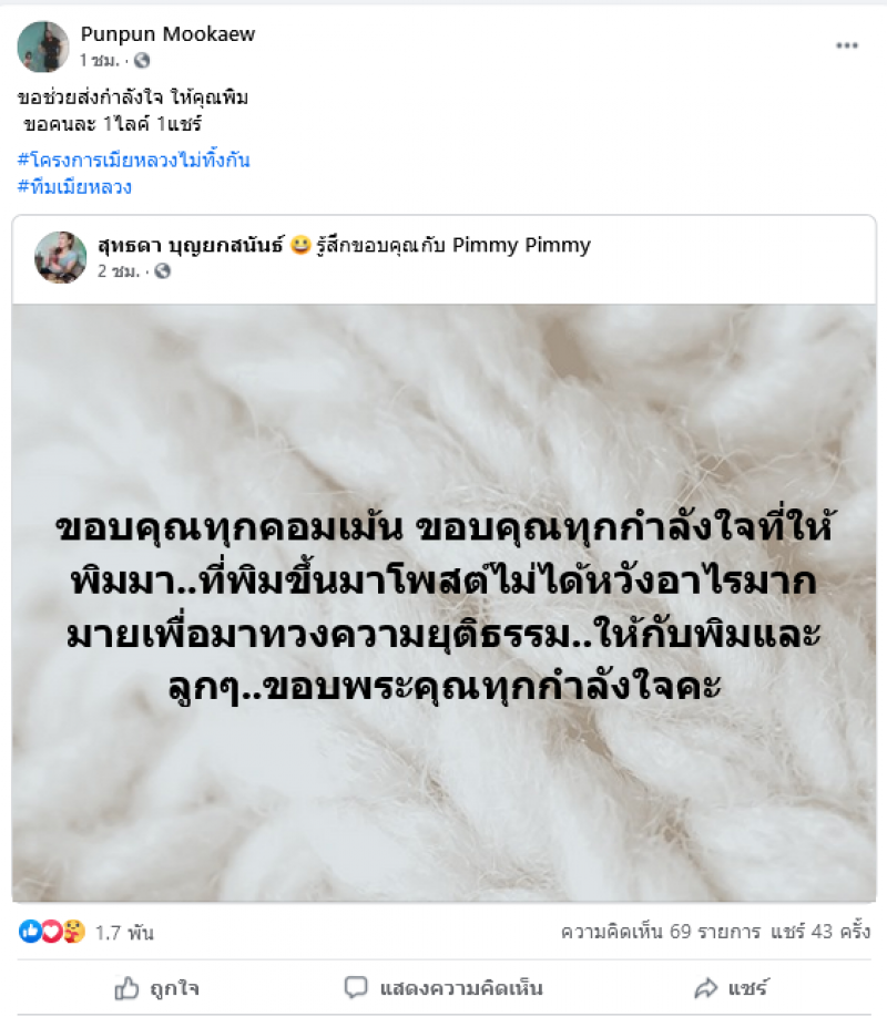 ล่าสุดด้านสาวจอย เมีย ห ล ว ง ที่แม่สามีพาบุกงานแต่งได้ออกมาโพสต์ให้กำลังใจ ผู้ใช้เฟสบุ๊คดังกล่าวโดยได้ระบุข้อความว่า