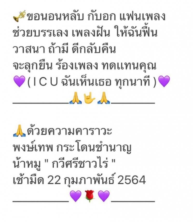 24 ก.พ.64 น้าหมู พงษ์เทพ กระโดนชำนาญ ศิลปินระดับตำนานในวงการเพลงเพื่อชีวิตเมืองไทย เข้ารักษาตัวที่โรงบาลเป็นการเร่งด่วน หลังจากล้มไม่สบายอย่างกะทันหัน จนต้องเข้าห้องไอซียู