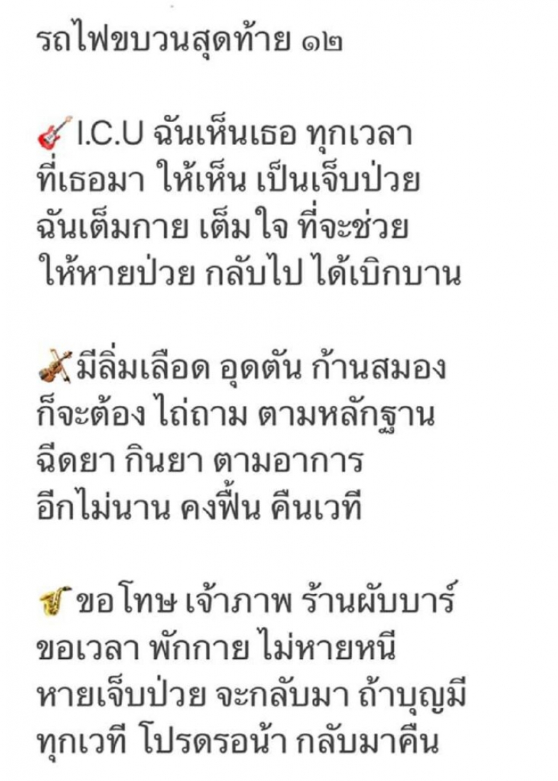 โดยน้าหมูได้ขอโทษบรรดาเจ้าภาพงานคอนเสิร์ตต่างๆ ที่ต้องขอยกเลิกงาน ซึ่งบรรดาเเฟนคลับเเฟนเพลงได้ส่งกำลังใจให้น้าหมูหายโดยเร็ว