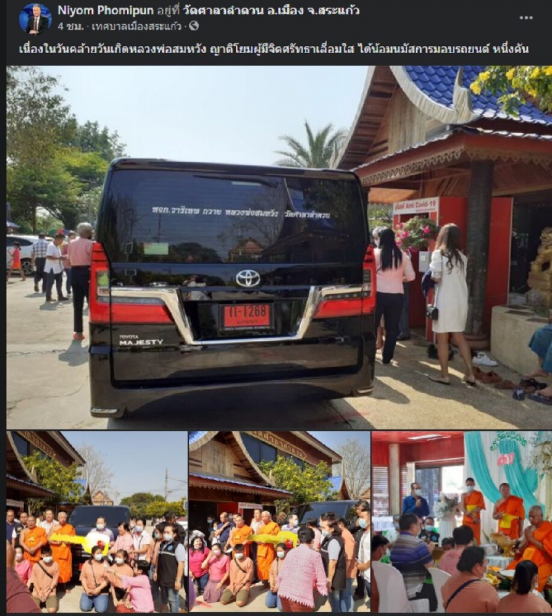 วันที่ 20 ก.พ.ผู้ใช้เฟซบุ๊ก Niyom Phomipu ได้โพสต์ภาพพร้อมข้อความระบุว่า เนื่องในวันคล้ายวันเกิดหลวงพ่อสมหวัง เจ้าอาวาสวัดศาลาลำดวน จ.สระแก้ว พระนักพัฒนา โดยญาติโยมผู้มีจิตศรัทธาเลื่อมใส ได้น้อมนมัสการมอบรถยนต์ หนึ่งคัน ภาพดังกล่าวเป็นกิจกรรมการจัดงานวันเกิดให้กับหลวงพ่อ โดยมีญาติโยมและลูกศิษย์เข้าร่วมกิจกรรมเป็นจำนวนมาก