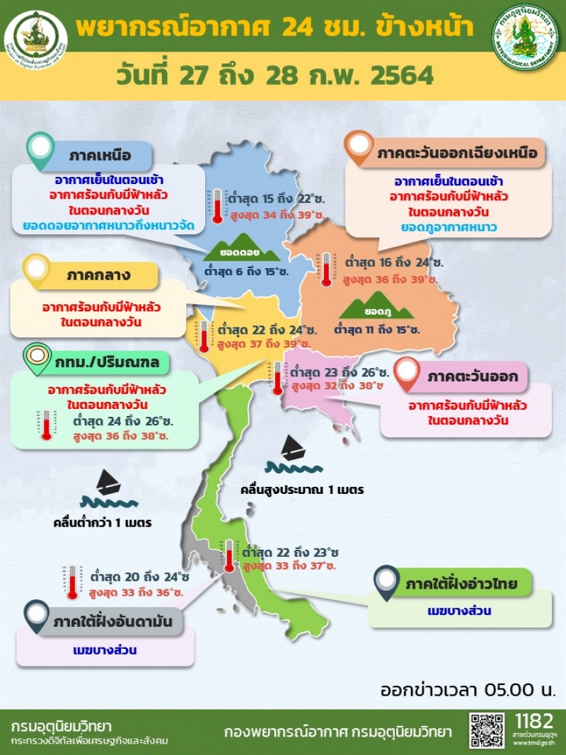 วันที่ 27 ก.พ. 2564 กรมอุตุนิยมวิทยา พยากรณ์อากาศ 24 ชั่วโมงข้างหน้า ระบุว่า ความกดอากาศต่ำเนื่องจากความร้อนปกคลุมประเทศไทยตอนบน ลักษณะเช่นนี้ทำให้บริเวณดังกล่าวมีอากาศร้อนกับมีฟ้าหลัวในตอนกลางวัน ในขณะที่ลมตะวันตกในระดับบนพัดพาความหนาวเย็นจากเทือกเขาหิมาลัยผ่านประเทศเมียนมาเข้ามาปกคลุมภาคเหนือและภาคตะวันออกเฉียงเหนือตอนบน ทำให้ภาคเหนือตอนบนและภาคตะวันออกเฉียงเหนือตอนบนมีอากาศเย็นในตอนเช้า ส่วนลมตะวันออกกำลังอ่อนยังคงพัดปกคลุมภาคใต้และอ่าวไทยทำให้คลื่นลมบริเวณอ่าวไทยและอันดามันมีกำลังอ่อน