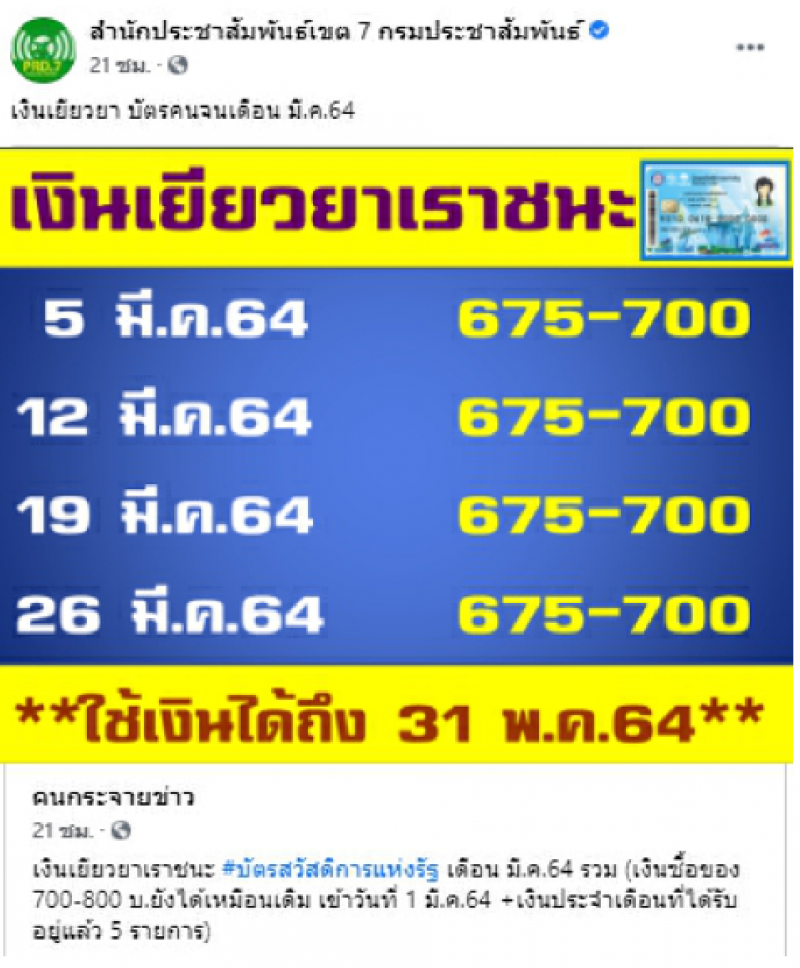 เมื่อวันที่ 26 กุมภาพันธ์ 2564 ที่เพจเฟซบุ๊ก สำนักประชาสัมพันธ์เขต 7 กรมประชาสัมพันธ์ ได้มีการโพสต์รูปภาพพร้อมทั้งระบุข้อความว่า เงินเยียวยาเราชนะ บัตรสวัสดิการแห่งรัฐ เดือน มี.ค.64 รวม (เงินซื้อของ 700-800 บ.ยังได้เหมือนเดิม เข้าวันที่ 1 มี.ค.64 +เงินประจำเดือนที่ได้รับอยู่แล้ว 5 รายการ)