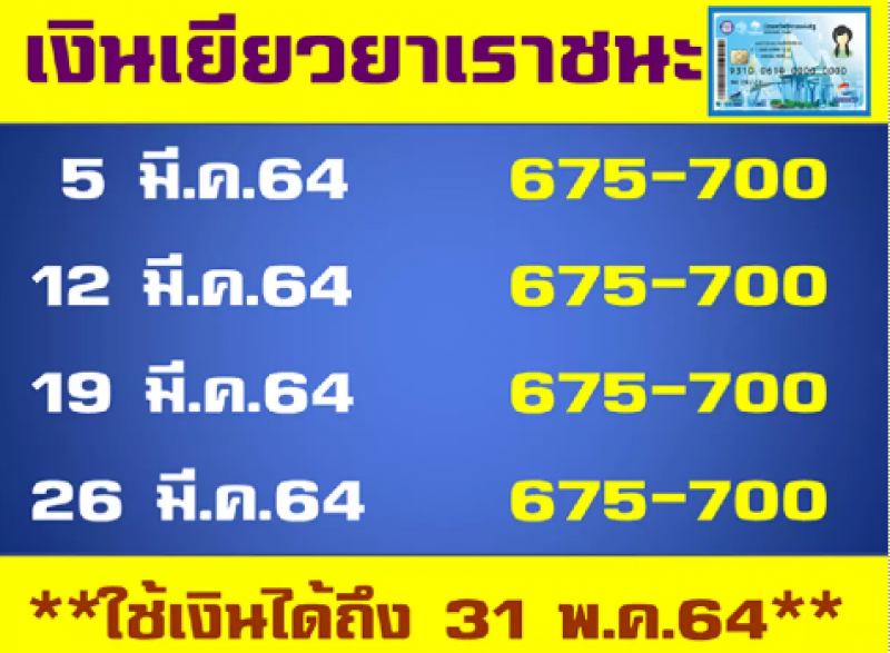 วันที่ 5 มีนาคม 2564 โอนเข้าบัตร 675 - 700 บาท
