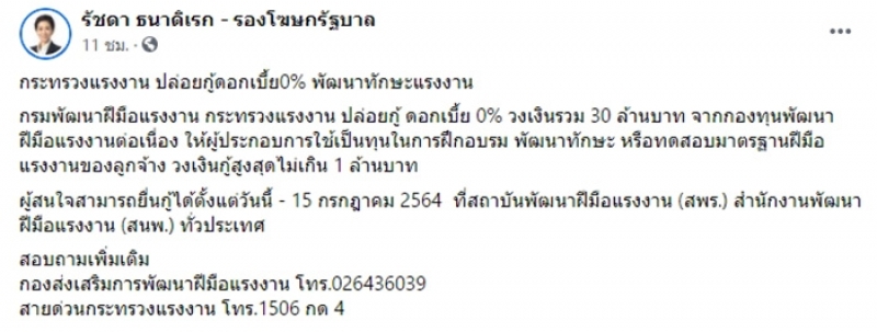 กรมพั ฒนาฝีมื อแรงงาน ก ระทรวงแรงงาน ให้ยืม ดอ กเบี้ย 0% วงเงิ นรวม 30 ล้านบา ท จากกองทุนพัฒนา ฝีมื อแรงงานต่ อเนื่อง ให้ผู้ประก อบการใช้เป็นทุนในก ารฝึกอบรม พัฒนาทัก ษะ หรือทดสอบมาตรฐ านฝีมือแร งงานของลู กจ้าง วงเงิ นกู้สูงสุดไม่เกิน 1 ล้าน