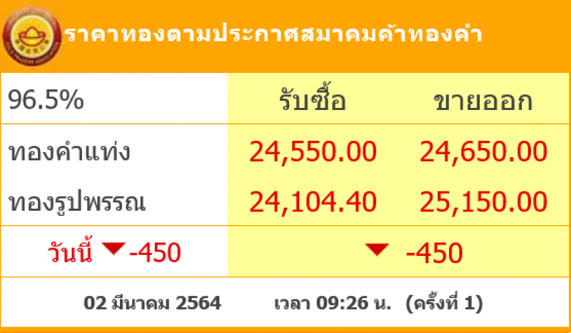 วันที่ 2 มกราคม 2564 สมาคมค้าทองคำรายงาน ราคาทองไทย ครั้งที่ 2 เมื่อเวลา 09:26 น. โดยราคาทองล่าสุดในวันนี้ ราคานั้น ได้ปรับลดฮวบลงมาถึง 450 บาท โดยวันนี้ทองคำแท่ ง รับซื้อบาทละ 24,550 ขายออกบาทละ 24,650 บาท ส่วนทองรูปพรรณ รับซื้อบาทละ 24,104.40 ขายออกบาทละ 25,150 บาท