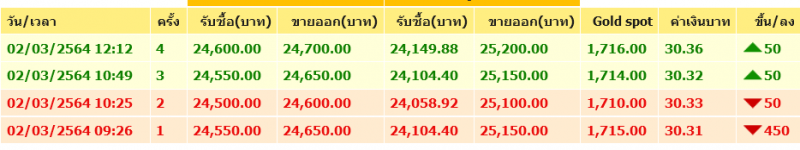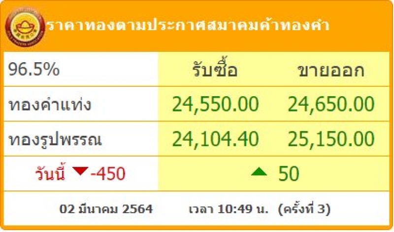 ราคาทอง วันที่ 2 มี.ค. 64 เวลา 10.49 น. (ประกาศรอบที่ 3) ทองแท่ง