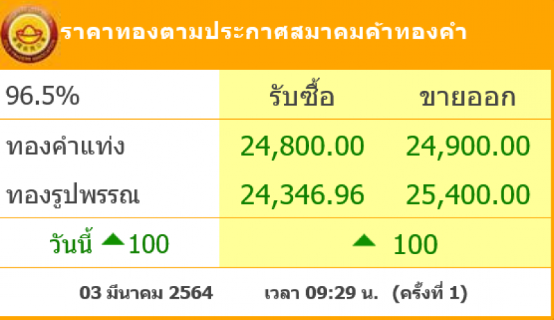 วันที่ 3 มีนาคม 2564 สมาคมค้าทองคำรายงาน ราคาทองไทย ครั้งที่ 1 เมื่อเวลา 09:29 น. โดยราคาทองล่าสุดในวันนี้ ราคานั้น ได้เริ่มปรับขึ้นมาอีกครั้ง หลังจากช่วงที่ผ่านมา ได้มีการปรับลดลงอย่างต่อเนื่อง โดยวันนี้ทองคำแท่ ง รับซื้อบาทละ 24,800 ขายออกบาทละ 24,900 บาท ส่วนทองรูปพรรณ รับซื้อบาทละ 24,346.96 ขายออกบาทละ 25,400 บาท