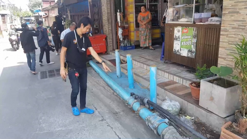 ที่ชุมชนคลองท้ายเมือง หมู่ที่ 13 ต.บางหญ้าแพรก อำเภอพระประแดง จ.สมุทรปราการ พบท่อประปาขนาดใหญ่ขวางบริเวณหน้าบ้านยาวตลอดทั้งซอย โดยที่บางส่วนอยู่ใต้ดิน บางส่วนอยู่บนพื้น และบางส่วนอยู่ในบ้าน ทำให้ชาวบ้านได้รับความ เดือด ร้อน