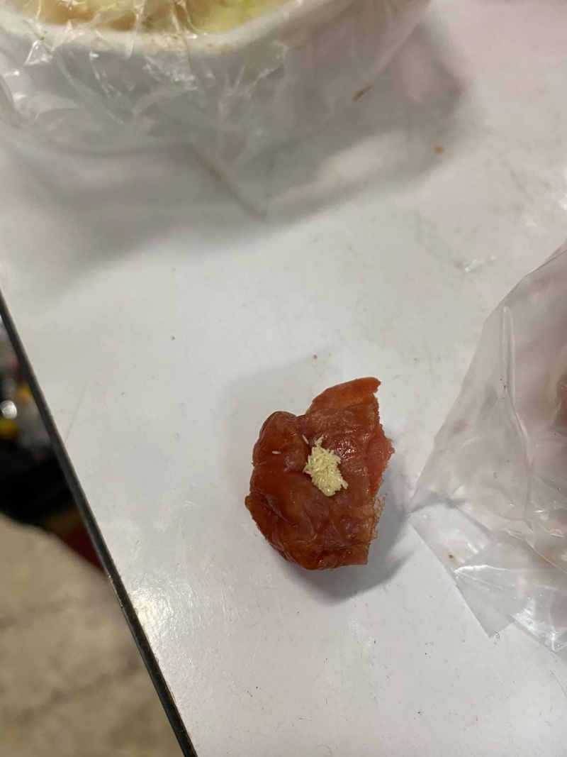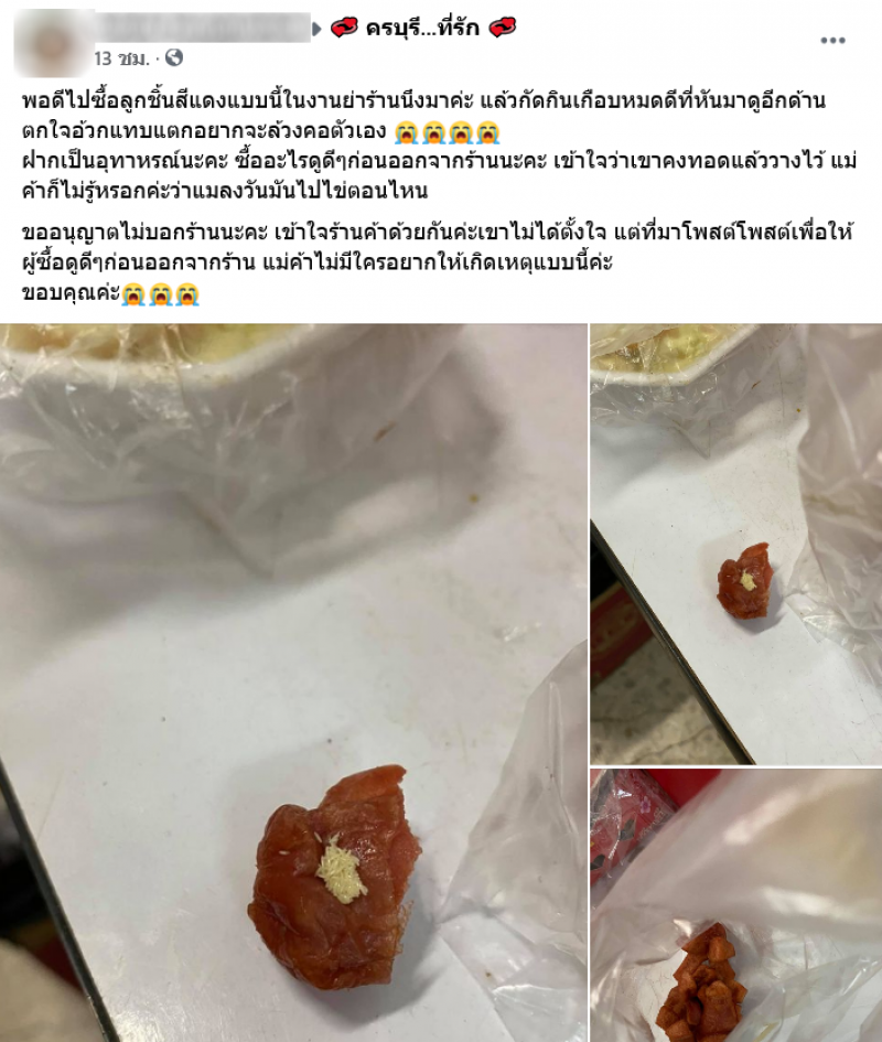 เรียกได้ว่าเป็นอีกหนึ่งเรื่องราว ต้องระวังกันให้ดีก่อนจะกินอะไร ผู้ใช้เฟซบุ๊กรายหนึ่ง ได้ออกมาเตือนหลังจากที่ตนได้ไปซื้อลูกชิ้นทอดมากิน โดยไม่ได้สังเกตว่า ในลูกชิ้น มีอะไรบางอย่าง ที่ผิดปกติ ซึ่งผู้โพสต์ระบุว่าพอดีไปซื้อลูกชิ้นสีแดงแบบนี้ในงานย่าร้านนึงมาค่ะ แล้วกัดกินเกือบหมดดีที่หันมาดูอีกด้าน ตกใจ