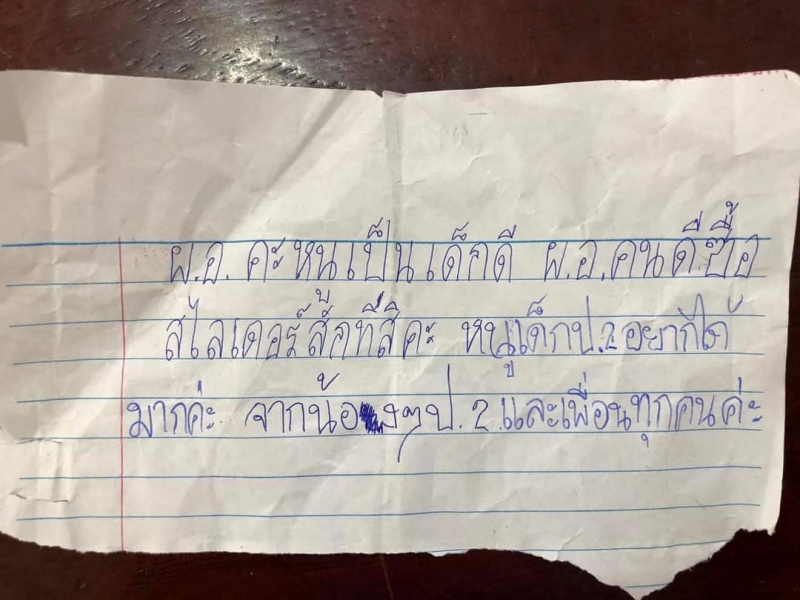 เรียกได้ว่าเป็นอีกหนึ่งเรื่องราว ที่น่าเอ็นดูในโซเชียล เมื่อนักเรียนชั้นประถมศึกษาที่ 2 ได้ทำการเขียนจดหมายส่งให้ผู้อำนวยการโรงเรียน โดยผู้ใช้เฟซบุ๊กชื่อว่า จารวี นวดแผนไทย เป็นผู้โพสต์ภาพจดหมายน้อย ที่เขียนด้วยลายมือ ซึ่งระบุข้อความว่า เมื่อนักเรียนอยากได้สไลเดอร์ครับ วันนี้ตอนบ่ายคุณครูได้หยิบกระดาษ จากกล่องแสดงความคิดเห็นแล้วนำมาให้ผมดู ซึ่งข้อความเขียนว่า ผอ. คะ หนูเป็นเด็กดี ผอ. คนดีซื้อสไลเดอร์ทีสิคะ หนูเด็กป.2 อยากได้มากค่ะ จากน้องๆ ป.2 และเพื่อนๆ ทุกคน (โรงเรียนไม่มีสไลเดอร์)