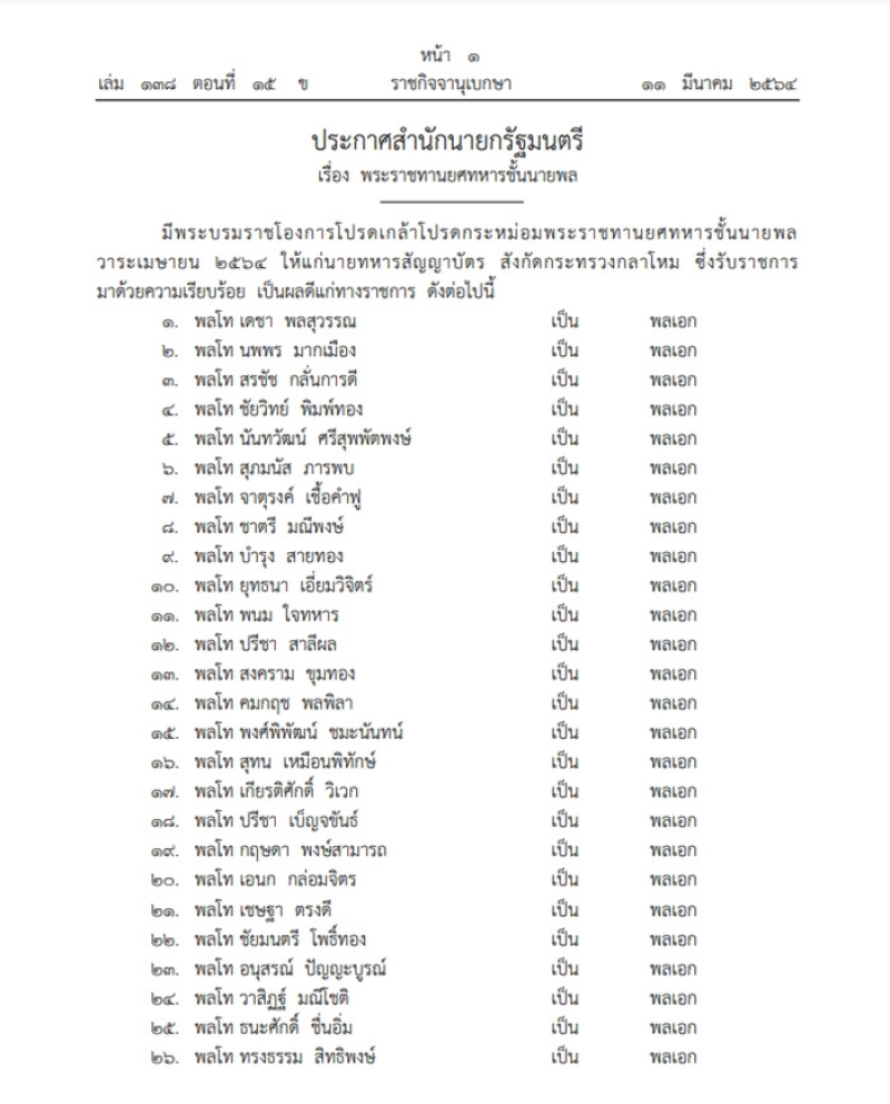 วันที่ 11 มีนาคม 2564 ราชกิจจานุเบกษา เผยแพร่ประกาศสำนักนายกรัฐมนตรี เรื่อง พระราชทานยศทหารชั้นนายพล ความว่า มีพระบรมราชโองการโปรดเกล้าโปรดกระหม่อมพระราชทานยศทหารชั้นนายพล