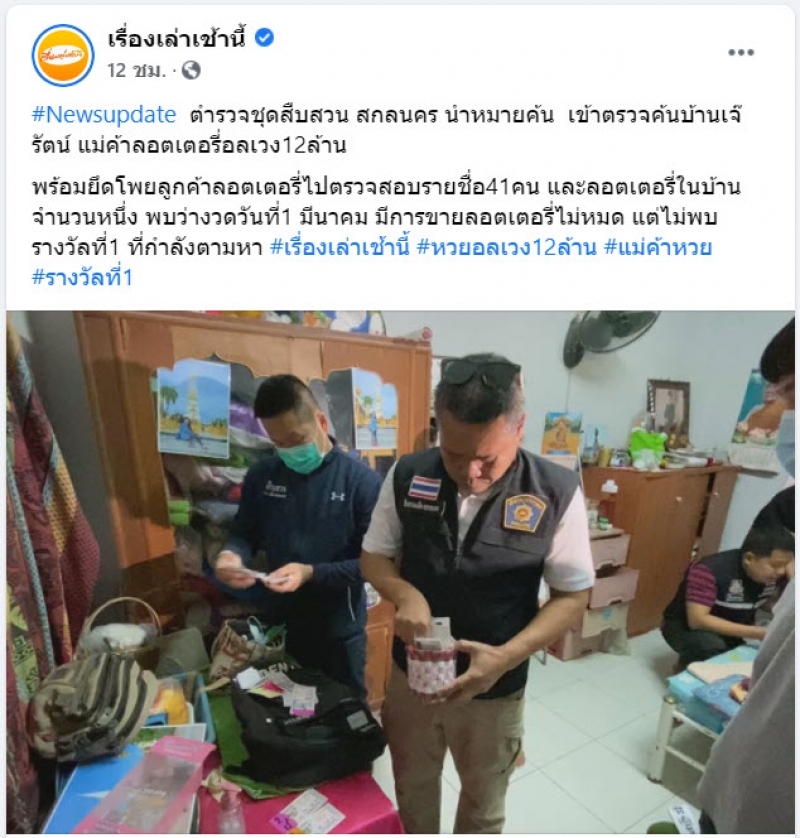 Newsupdate ตำรวจชุดสืบสวน สกลนคร นำหมายค้น เข้าตรวจค้นบ้านเจ๊รัตน์ แม่ค้าลอตเตอรี่อลเวง12ล้าน พร้อมยึดโพยลูกค้าลอตเตอรี่ไปตรวจสอบรายชื่อ 41 คน และลอตเตอรี่ในบ้านจำนวนหนึ่ง พบว่างวดวันที่1 มีนาคม มีการขายลอตเตอรี่ไม่หมด แต่ไม่พบ รางวัลที่ 1 ที่กำลังตามหา #เรื่องเล่าเช้านี้ #หวยอลเวง12ล้าน #แม่ค้าหวย #รางวัลที่ 1