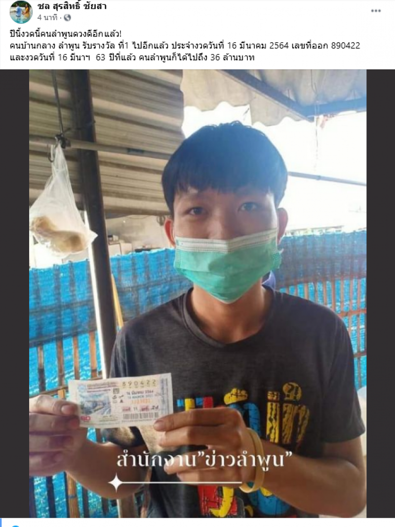 ล่าสุดเฟสบุ๊ค ชล สุรสิทธิ์ ชัยสา ได้ออกมาโพสต์ภาพถูกรางวัลที่ 1 โดยได้ระบุข้อความว่า คนบ้านกลาง ลำพูน รับรางวัล ที่1 ไปอีกแล้ว ประจำ ง ว ด วันที่ 16 มีนาคม 2564 เลขที่ออก 890422 และงวดวันที่ 16 มีนาฯ 63 ปีที่แล้ว คนลำพูนก็ได้ไปถึง 36 ล้านบาท