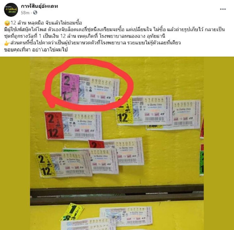 ซึ่งทางเพจ กาฬสินธุ์อัพเดท ได้เผยเรื่องราวอันสุดช้ำใจ น่าเสียดาย กับรางวัลที่1 ที่ได้หลุดลอยไปต่อหน้าต่อตา 12 ล้าน หลุดมือ จับแล้วไม่ยอมซื้อ มีผู้ใช้เฟซบุ๊คได้โพสต์รายหนึ่ง เผยว่า ตัวเองจับล็อตเตอรี่ชุดหนึ่งเตรียมจะซื้อ แต่เปลี่ยนใจ ไม่ซื้อ แล้วถ่ายรูปเก็บไว้ กลายเป็นชุดที่ถูกรางวัลที่ 1 เป็นเงิน 12 ล้านบาท เหตุเกิดที่ โรงพยาบาลหนองฉาง อุทัยธานี ส่วนคนที่ซื้อไปคาดว่าเป็นผู้ป่วยมานวดตัวที่โรงพยาบาล รวยแบบไม่รู้ตัวเลยที่เดียว ขอบคุณที่มา อย่า'เอาไข่ผมไป