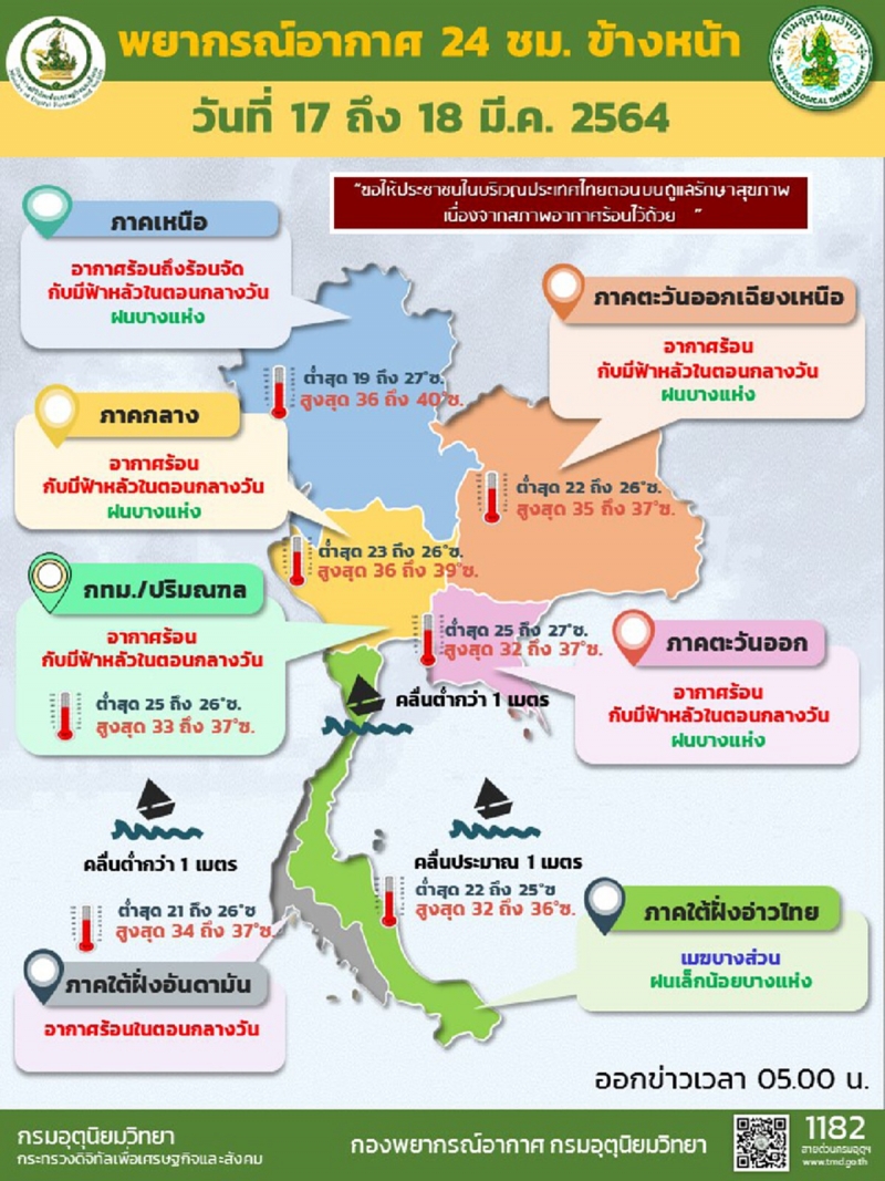 ลักษณะอากาศทั่วไป พยากรณ์อากาศ 24 ชั่วโมงข้างหน้า ความกดอากาศต่ำเนื่องจากความร้อนปกคลุมบริเวณภาคเหนือและภาคกลางตอนบน ทำให้ประเทศไทยตอนบนมีอากาศร้อนกับมีอากาศร้อนจัดเป็นบางพื้นที่ในบริเวณภาคเหนือและฟ้าหลัวในตอนกลางวัน ประกอบกับลมใต้และลมตะวันออกเฉียงใต้ยังคงพัดนำความชื้นเข้ามาปกคลุมภาคเหนือตอนล่าง ภาคตะวันออกเฉียงเหนือ ภาคกลาง และภาคตะวันออก ทำให้บริเวณดังกล่าวมีฝนบางแห่ง ขอให้ประชาชนในบริเวณประเทศไทยตอนบนดูแลรักษาสุขภาพเนื่องจากสภาพอากาศที่ร้อนถึงร้อนจัดไว้ด้วย