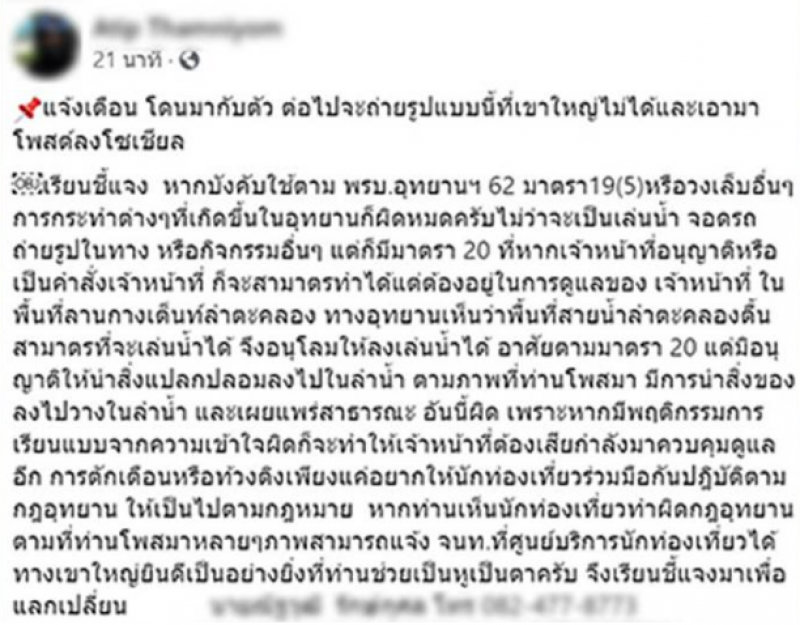 เป็นอีกหนึ่งเรื่องราว ที่ถูกพูดถึงอย่างมาก หลังจากที่มีผู้ใช้เฟซบุ๊กรายหนึ่งได้ออกมาเผยเรื่องราวเตือนสายเที่ยวแบบแคมป์ปิ้ง เนื่องจากตนเองได้เดินทางไปท่องเที่ยวอุทยานแห่งชาติเขาใหญ่ จ.นครราชสีมา และได้ถ่ายภาพลงโซเชียลแบบที่หลายมักชอบถ่าย คือการนำเก้าอี้ลงไปวางกลางลำน้ำและถ่ายภาพ รวมถึงการจอดรถถ่ายรูประหว่างทาง ซึ่งจะมีความผิดตามกฎหมาย พ.ร.บ.อุทยานแห่งชาติ โดยเจ้าของโพสต์ดังกล่าวระบุข้อความว่า แจ้งเตือน โดนมากับตัว ต่อไปจะถ่ายรูปแบบนี้ที่เขาใหญ่ไม่ได้และเอามาโพสต์ลงโซเชียล
