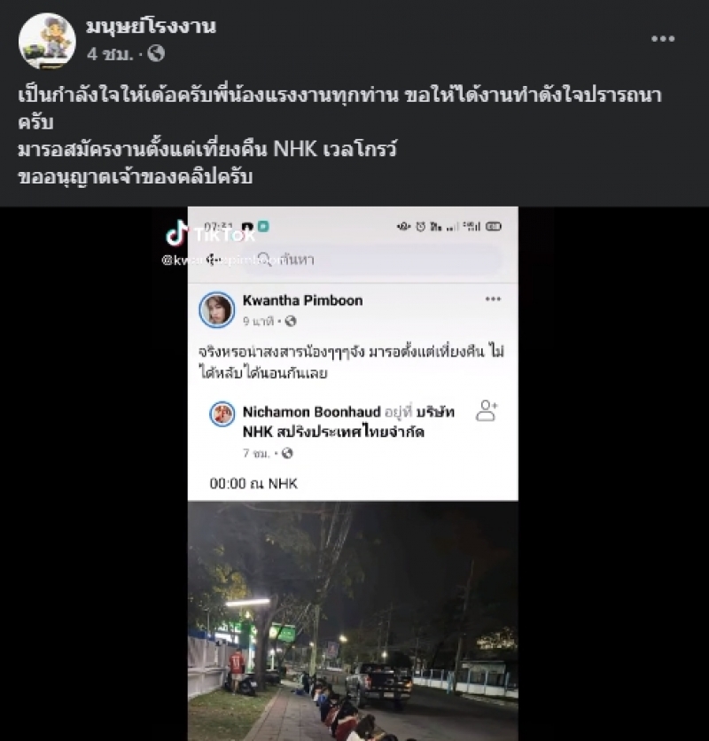นอกจากนี้ทางด้านเพจ มนุษย์โรงงาน ยังได้โพสต์ข้อความด้วยว่า เป็นกำลังใจให้เด้อครับพี่น้องแรงงานทุกท่าน ขอให้ได้งานทำดังใจปรารถนาครับ มารอสมัครงานตั้งแต่เที่ยงคืน NHK เวลโกรว์ ขออนุญาตเจ้าของคลิปครับ
