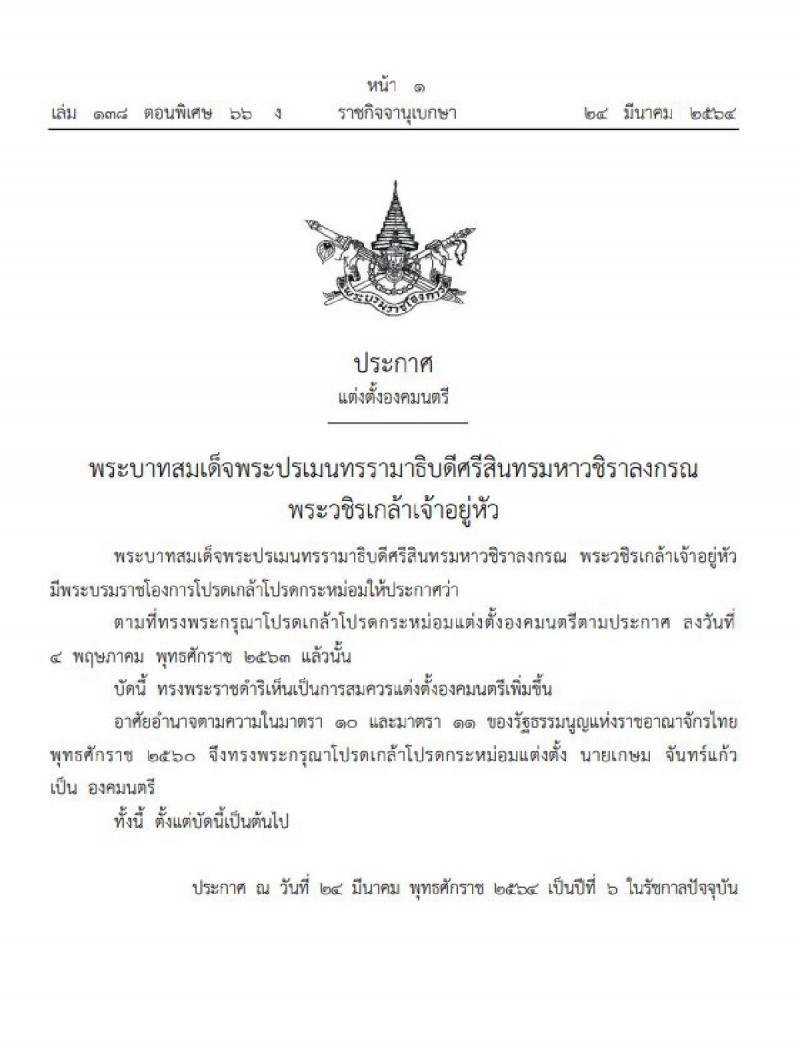 ทั้งนี้ ตั้งแต่บัดนี้เป็นต้นไป ประกาศ ณ วันที่ ๒๔ มีนาคม พุทธศักราช ๒๕๖๔ เป็นปีที่ ๖ ในรัชกาลปัจจุบัน