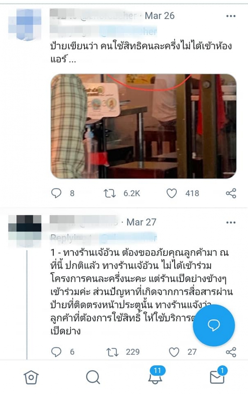 แต่หลังจากนั้นไม่นานทางร้านข้าวมันไก่ที่เป็นเจ้าของเดียวกับร้านข้าวหน้าเป็ด ได้มาตอบกลับลูกค้าว่า พนักงานในร้านน่าจะสื่อสารผิด ที่ห้ามนั่งห้องแอร์เฉพาะลูกค้าที่สั่งข้าวหน้าเป็ดและจ่ายด้วยแอพ คนละครึ่ง