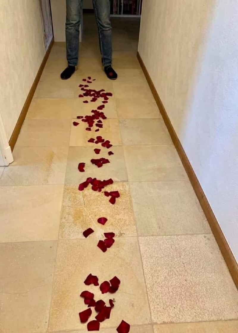 ต้องบอกเลยว่าเป็นอีกหนึ่งภาพเหตุการณ์ที่โลกออนไลน์เข้ามาแสดงความเห็น และให้ความสนใจกัน้ป็นจนำนวนมาก หลังเมื่อผู้ใช้เฟซบุ๊กรายหนึ่งได้ออกมาโพสต์ภาพเล่าเรื่องราวของชายหนุ่มรายหนึ่ง หลังกลับมาจากทำงานแล้วพบว่า แฟนสาวทำเซอร์ไพรส์โรยกลีบกุหลาบให้เดินตาม ด้วยความตื่นเต้นตนจึงรีบเดินตามเพราะอยากรู้ว่าอะไรรออยู่ข้างหน้า แต่เมื่อเห็นแล้วถึงกับเข่าอ่อนเลยทีเดียว