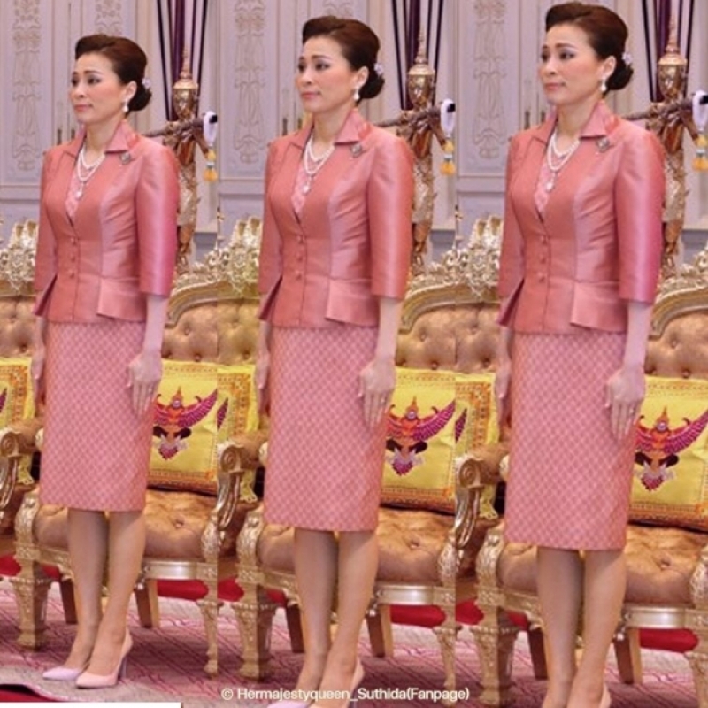 โดยในการนี้ พระราชินี ทรงฉลองพระองค์ผ้าไหมพื้นเรียบ "พระภูษาผ้าไหมมัดหมี่ลายดางแห ย้อมครั่ง"