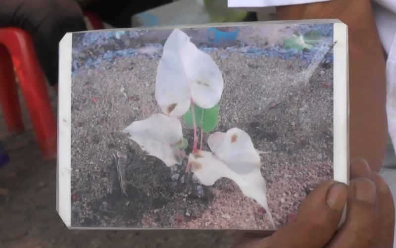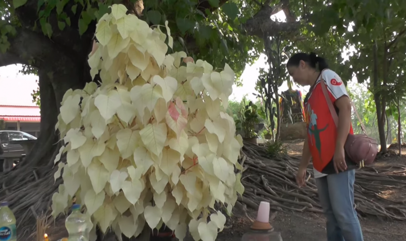 ส่วนต้นที่มีใบสีขาวนั้นเมื่อประมาณ 16 ปีที่ผ่านมา ขณะที่ตนกำลังกวาดใบโพธิ์ที่ร่วงหล่นและทับถมกันอยู่นั้นก็ได้เห็นใบโพธิ์ ในทีแรกตนเข้าใจว่าเป็นดอกเห็ด แต่เมื่อสังเกตดี ๆ จึงพบว่าเป็นต้นโพธิ์ที่แตกขึ้นมาจากรากของต้นใหญ่ มีใบสีขาว 3 ใบ และสีเขียว 1 ใบ