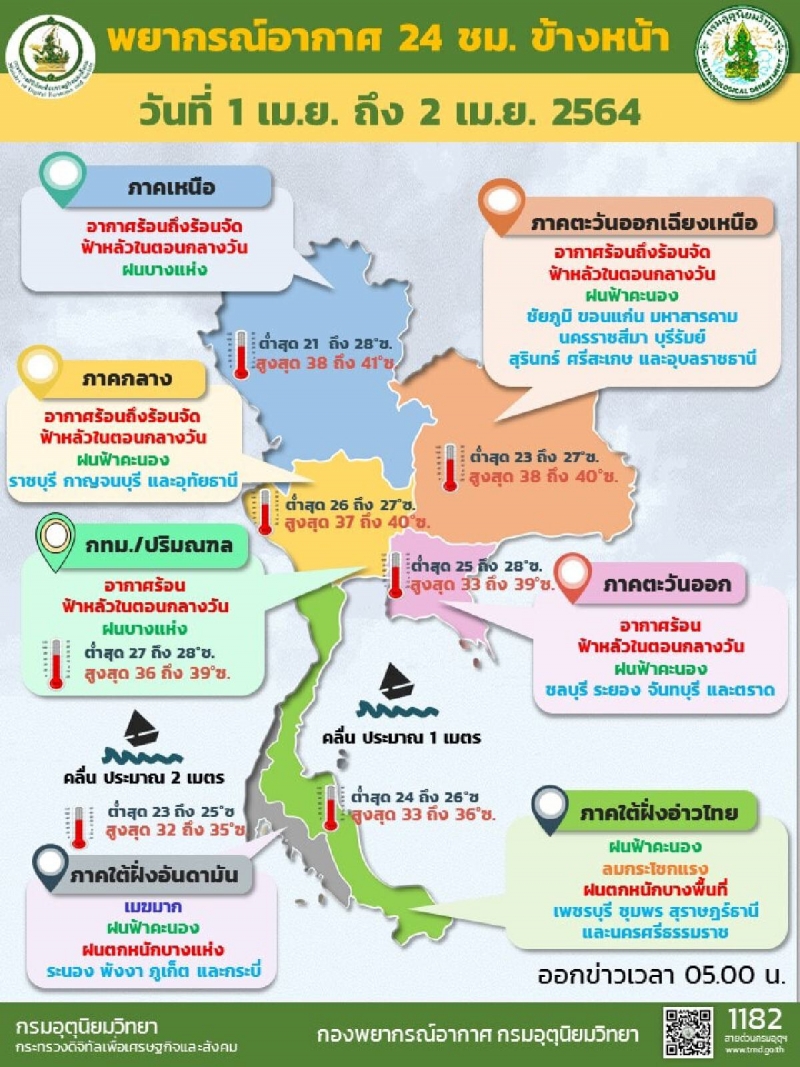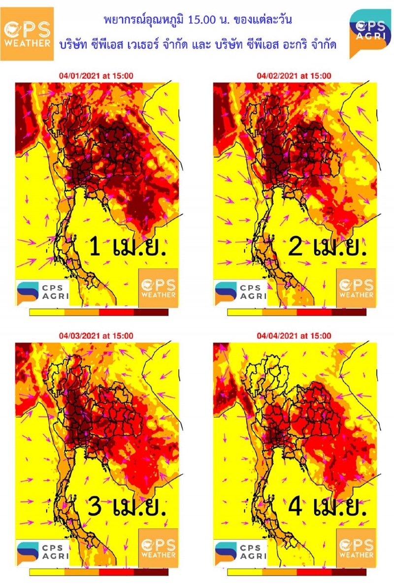 พยากรณ์ช่วงร้อนของแต่ละวัน 1-4 เม.ย. ! รูปนี้แสดงพยากรณ์อุณหภูมิ เวลา 15.00 น. ของแต่ละวัน ติดตามอัพเดทผลการพยากรณ์ได้ทางเพจนี้ครับ
