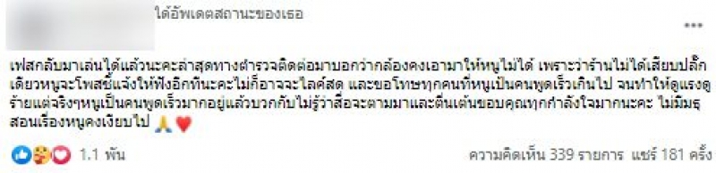อย่างไรก็ตาม นักศึกษาหญิงคนดังกล่าวยังระบุอีกว่า เดียวตนเองจะมาโพสต์ชี้แจ้งให้ฟังอีกที ไม่ก็อาจจะไลฟ์สดชี้แจง และตนเองต้องขอโทษทุกคนที่เป็นคนพูดเร็วเกินไป จนทำให้ดูแรงดูร้ายแต่จริงๆตนเองป็นคนพูดเร็วมากอยู่แล้วบวกกับไม่รู้ว่าสื่อจะตามมาและตื่นเต้น ต้องขอบคุณทุกกำลังใจมาก