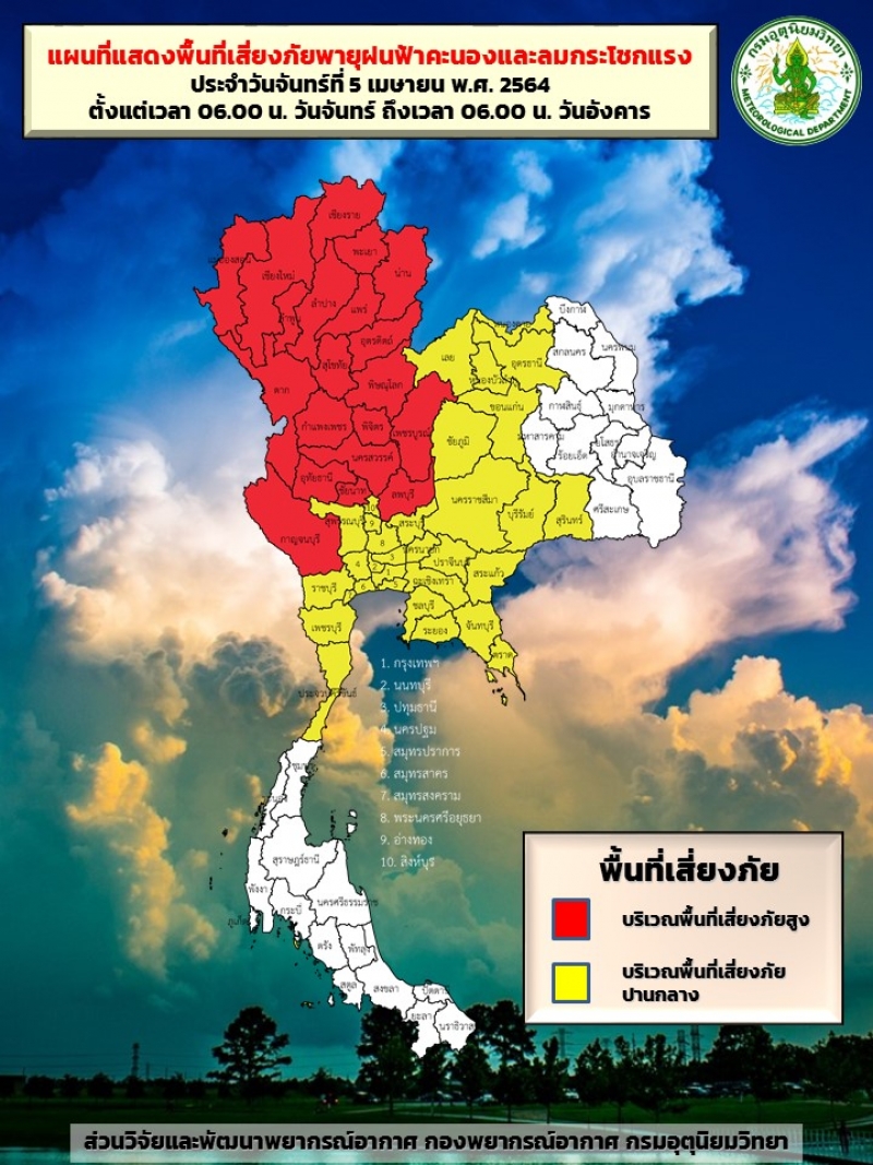 กรมอุตุฯ รายงานแผนที่แสดงพื้นที่เสี่ยงภัยพายุฝนฟ้าคะนอง และลมกระโชกแรง ประจำวันที่ 5 เมษายน 2564 ตั้งแต่เวลา 06.00 น. ถึงเวลา 06.00 น. วันที่ 6 เมษายน 2564 โดยจังหวัดที่เป็นพื้นที่เสี่ยงภัย ได้แก่ เชียงราย (พื้นที่เสี่ยงภัยสูง), เชียงใหม่ (พื้นที่เสี่ยงภัยสูง), แม่ฮ่องสอน (พื้นที่เสี่ยงภัยสูง), ตาก (พื้นที่เสี่ยงภัยสูง), ลำพูน (พื้นที่เสี่ยงภัยสูง), ลำปาง (พื้นที่เสี่ยงภัยสูง), พะเยา (พื้นที่เสี่ยงภัยสูง), น่าน (พื้นที่เสี่ยงภัยสูง), แพร่ (พื้นที่เสี่ยงภัยสูง), สุโขทัย (พื้นที่เสี่ยงภัยสูง), อุตรดิตถ์ (พื้นที่เสี่ยงภัยสูง), พิษณุโลก (พื้นที่เสี่ยงภัยสูง), กำแพงเพชร (พื้นที่เสี่ยงภัยสูง), พิจิตร (พื้นที่เสี่ยงภัยสูง), นครสวรรค์ (พื้นที่เสี่ยงภัยสูง), เพชรบูรณ์ (พื้นที่เสี่ยงภัยสูง), เลย, หนองคาย, อุดรธานี, หนองบัวลำภู, ขอนแก่น, ชัยภูมิ, นครราชสีมา, บุรีรัมย์, สุรินทร์